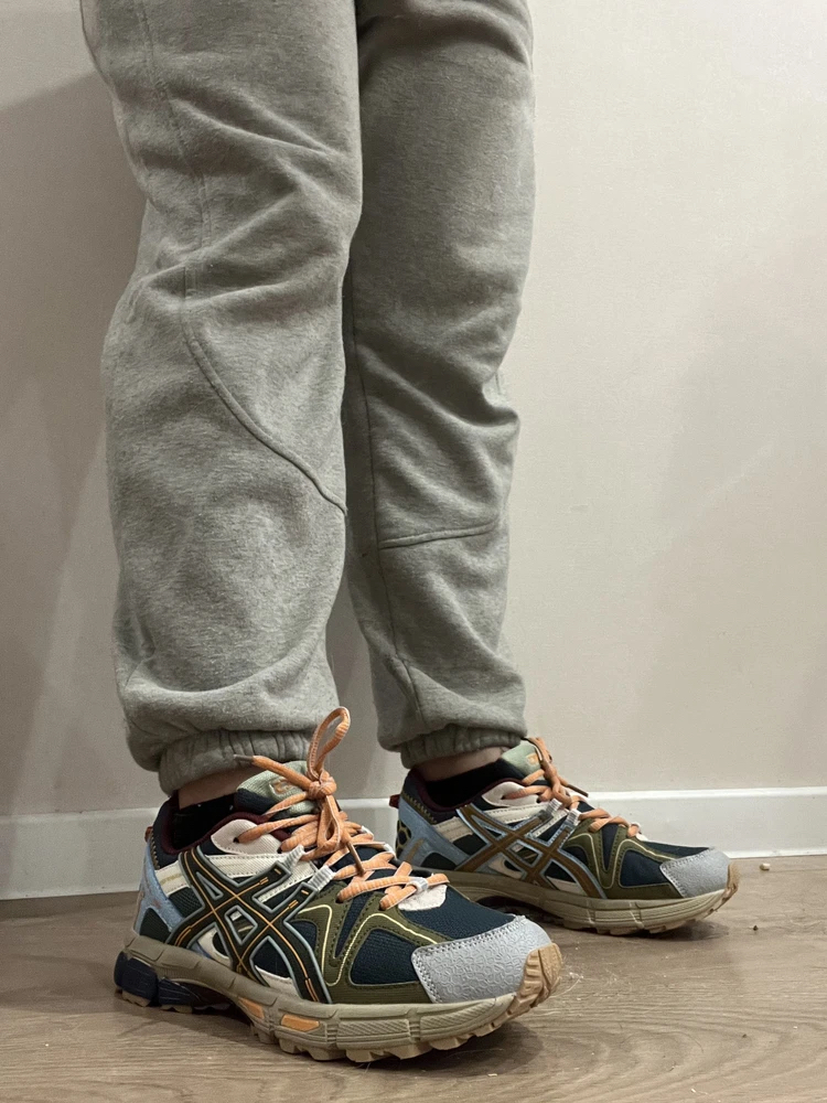 Кроссовки Asics Gel Kahana 8, сине-коричневые. Использую для треккинга и походов в лес. Амортизация отличная, ноги не устают. Подошва цепкая, не скользит по мокрым камням. Внешний вид спортивный, но не кричащий. Размер соответствует